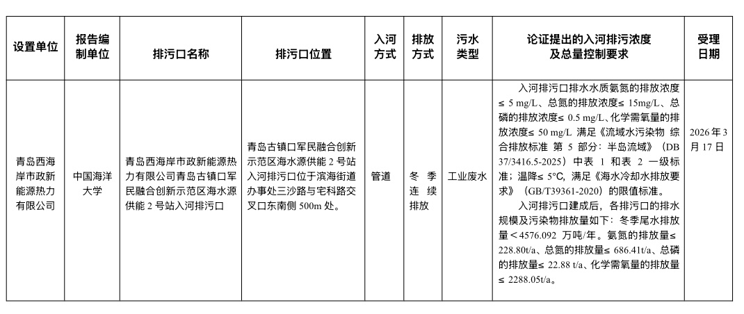 根据《中华人民共和国行政许可法》《入河排污口监督管理办法》等相关法律法规规定要求,我局于2026年3月17日受理青岛西海岸市政新能源热力有限公司青岛古镇口军民融合创新示范区海水源供能2号站入河排污口设置申请。