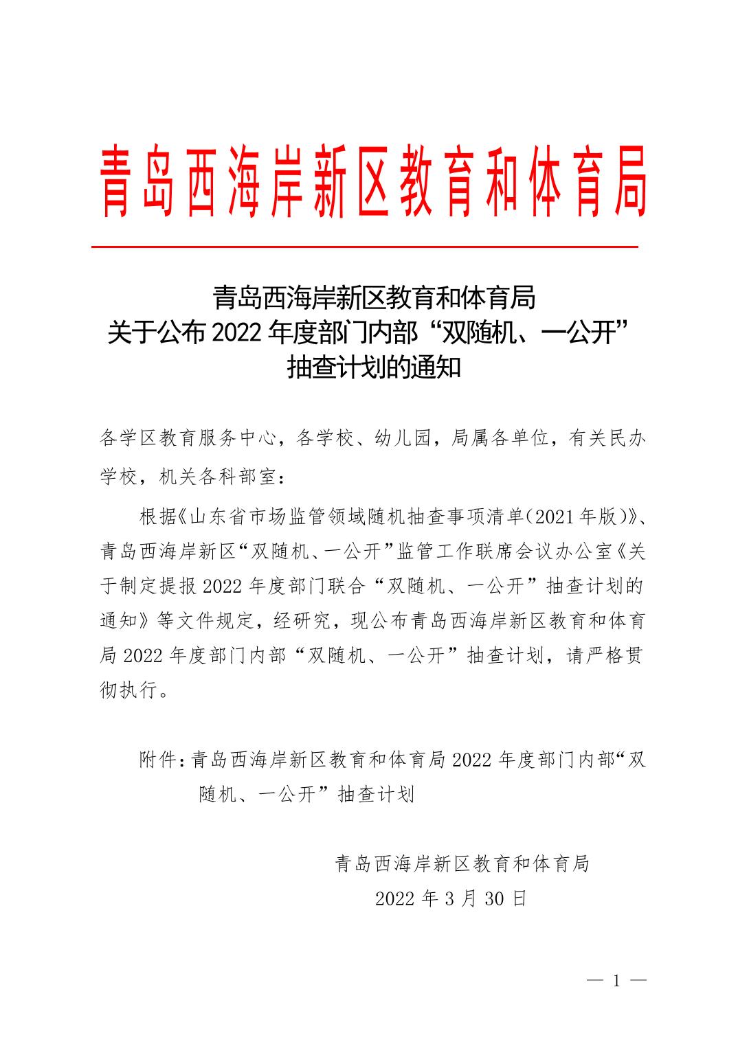 关于公布2022年度区教体局部门内部“双随机、一公开”抽查计划的通知
