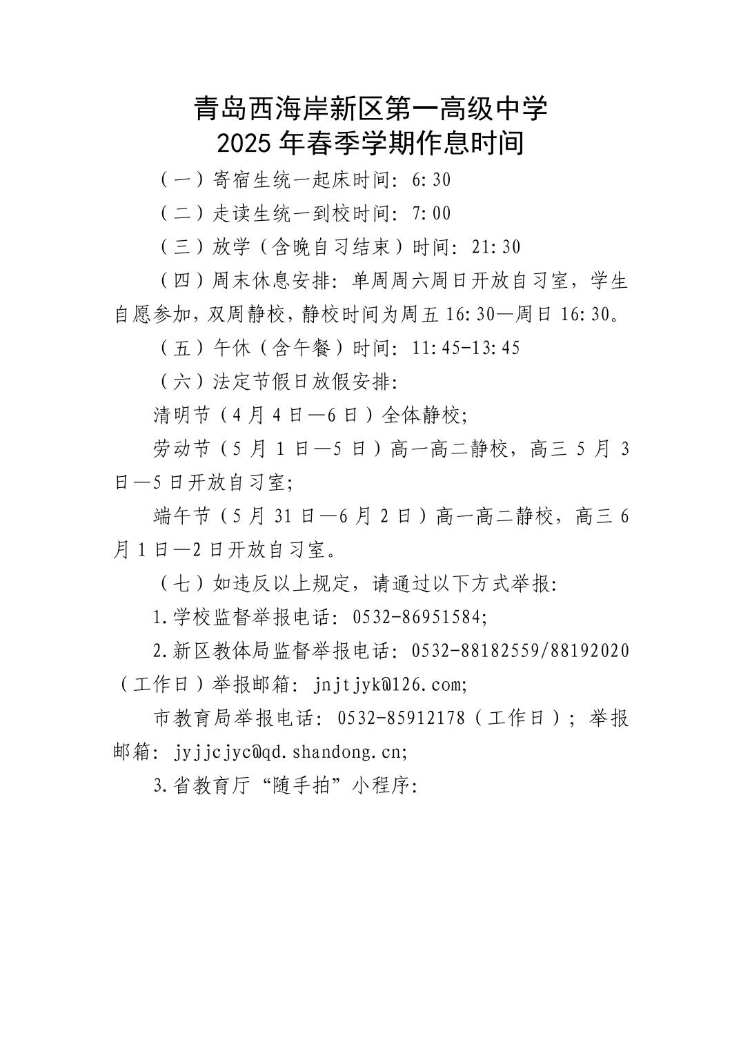 青岛西海岸新区第一高级中学2025年春季学期作息时间