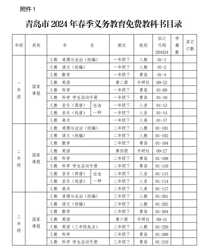 现将青岛市教育局下发的《青岛市2024年春季义务教育免费教科书目录》《青岛市中小学教辅材料推荐选用目录》公示如下,接受社会监督。