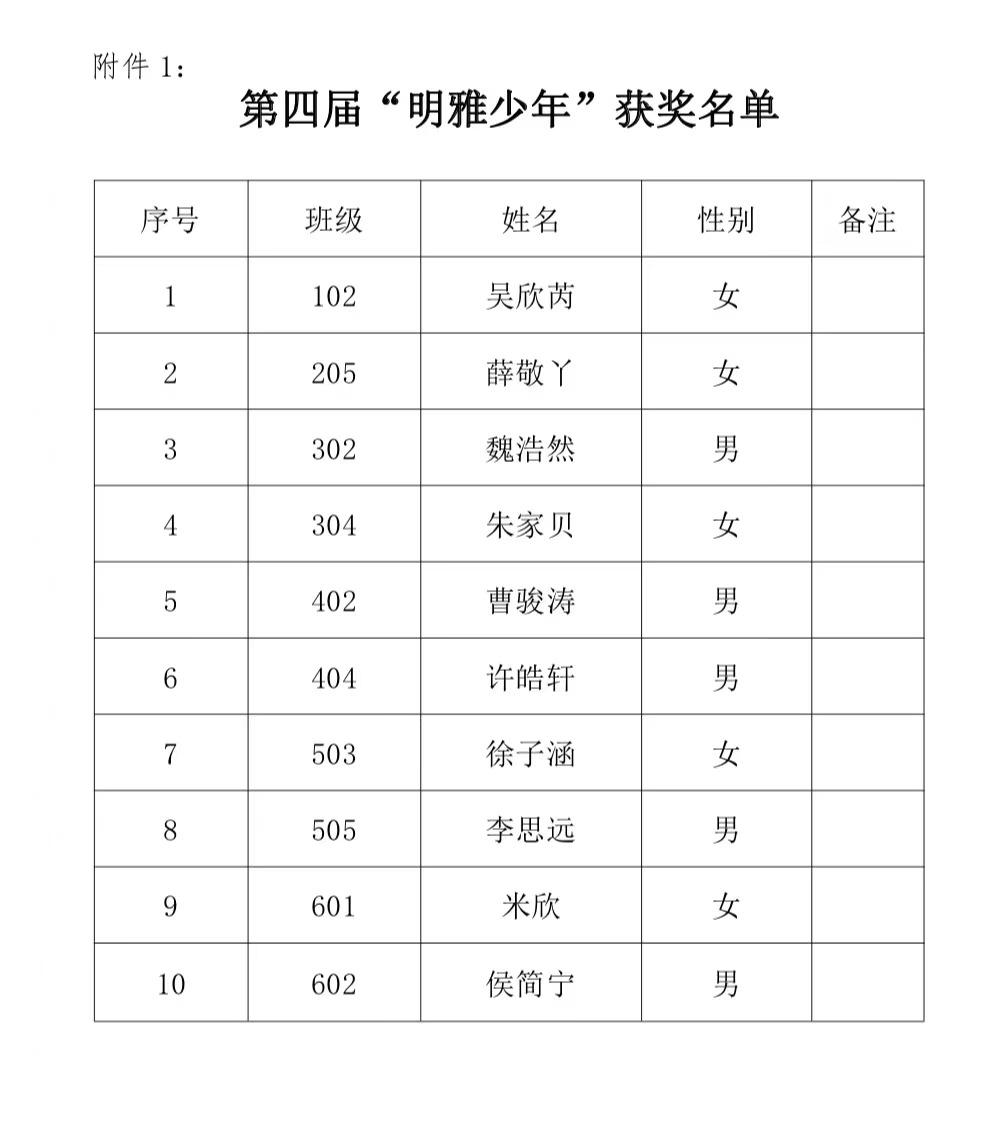 根据《青岛经济技术开发区第二实验小学第四届“明雅少年”“学习型家庭”的评选方案》通知,经班级推荐、学校评委会综合评定,确定10名同学为“明雅少年”人选,具体名单见附件。现将评选结果予以公示。