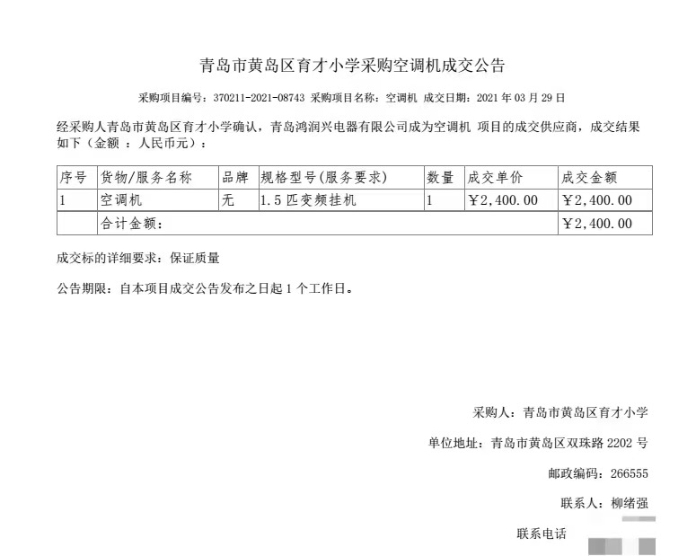 【采购信息】青岛西海岸新区育才小学采购空调机成交公告