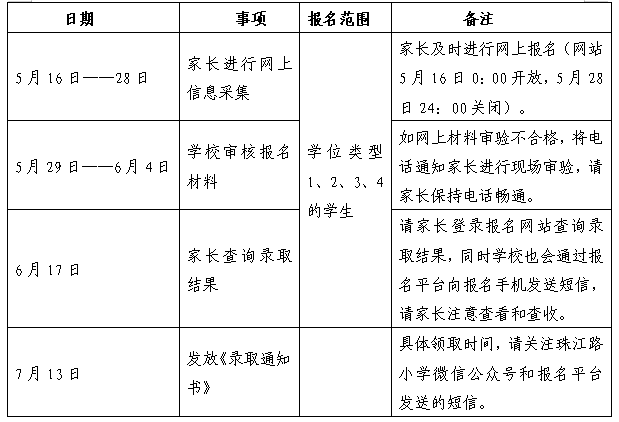 4.请关注珠江路小学微信公众号。招生期间,学校将陆续通过公众号发布资格审核、录取通知书发放等相关通知,请家长持续关注学校公众号动态,保持手机畅通。