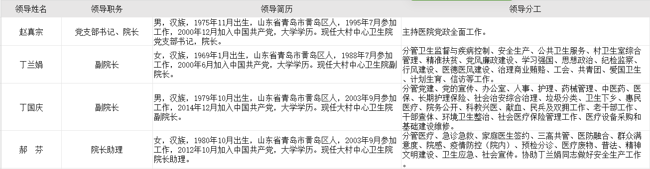 青岛西海岸新区大村中心卫生院现有基层主任医师2名,副主任医师2名,基层副主任医师1名,主治医师9名,基层副主任护师2名,副主任护师4名,主管护师3名。
