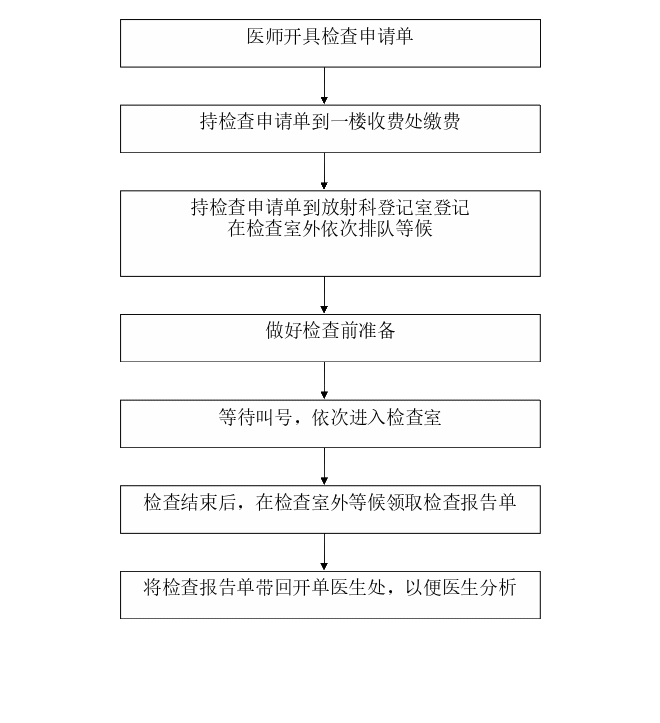 将检查申请单或缴费发票交给科室工作人员 在检查室外依次排队等候 |