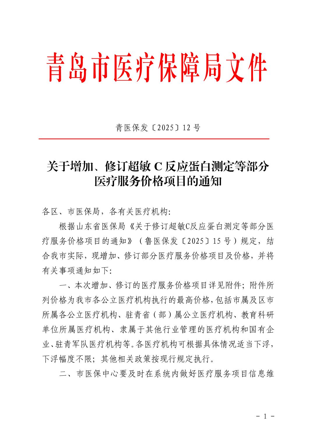 关于增加、修订超敏C反应蛋白测定等部分医疗服务价格项目的通知