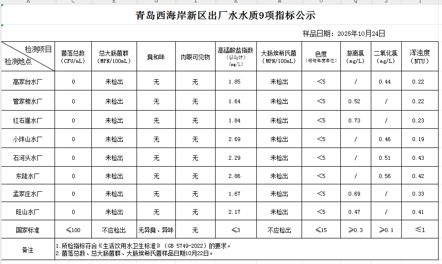 2025年10月24日青岛西海岸新区城市供水水质公报
