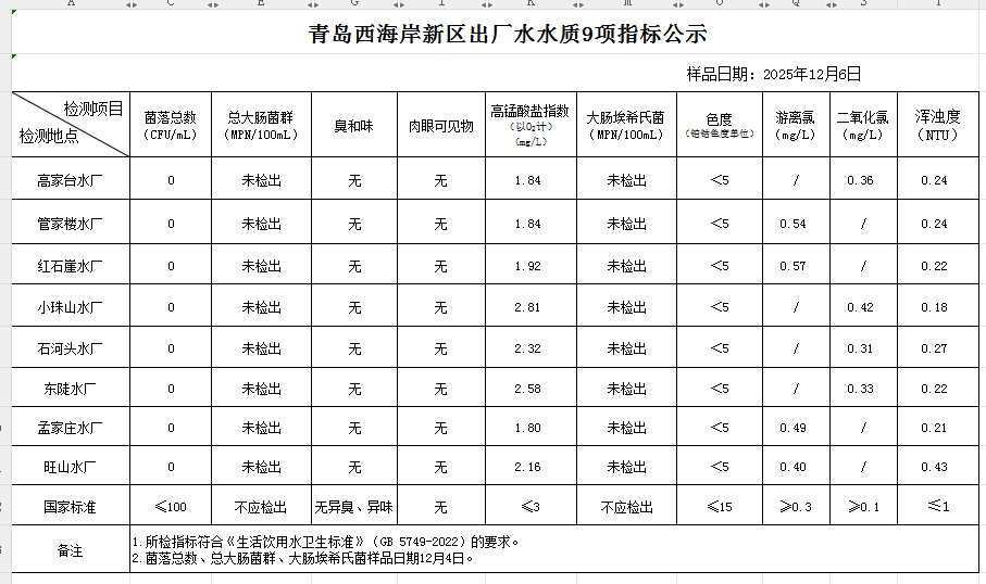 2025年12月6日青岛西海岸新区城市供水水质公报
