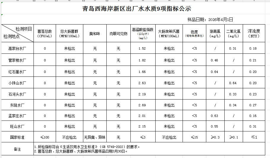 2026年4月1日青岛西海岸新区城市供水水质公报