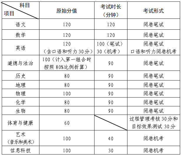 2023级学生考试科目:语文、数学、英语(含口语和听力)、道德与法治、历史、物理、化学、体育与健康、艺术(音乐和美术)、实验操作(物理或化学)。