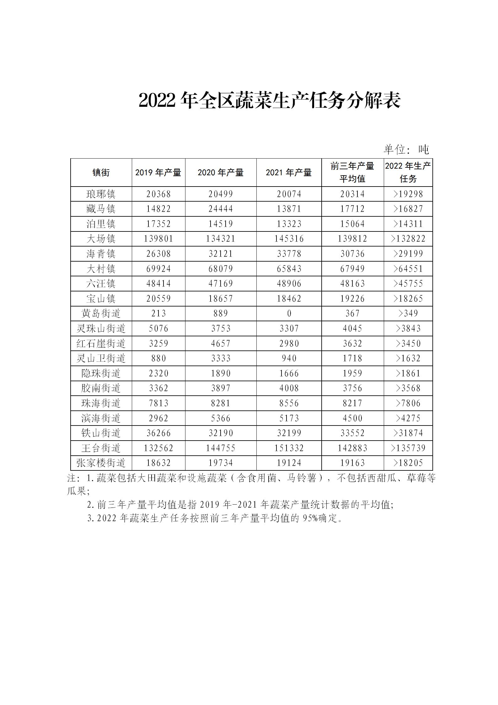 2022年是党的二十大召开之年,是实施“十四五”规划承上启下之年,做好蔬菜稳产保供工作具有特殊重要意义。各镇街、各部门要牢牢扛起蔬菜稳产保供责任,确保地产蔬菜稳定生产和供应。今年蔬菜生产列入省乡村振兴考核办法,具体指标为“蔬菜稳产保供”,指标内容为“本年度生产蔬菜(含食用菌、马铃薯,不含西甜瓜、草莓)产量达到或超过前3年平均值95%得满分4分。每降低1个百分点扣0.2分,最高扣0.5分;不足1个百分点,同比例折算分值”。2022年,各镇街要着力稳定蔬菜面积和产量,全区蔬菜总产量不低于56.31万吨。各镇街要按照分解的任务,压实责任、明确分工,确保完成2022年蔬菜生产任务(附件1)。