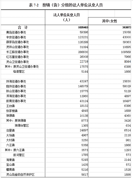按镇(街)分组的法人单位从业人员情况详见表7-2。