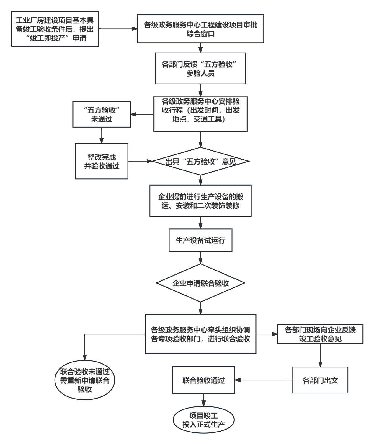 “竣工即投产”是指工业厂房建设项目基本具备竣工验收条件后(按照施工图纸要求完成施工合同内容并主体验收合格,如:外立面已完成、底部管网已完成、混凝土已浇捣并具备强度要求等),企业向各级政务服务中心工程建设项目审批综合窗口(以下简称综合窗口)申请竣工验收前指导服务,并提交相关申请资料。经审核通过后,由各级政务服务中心牵头组织相关部门同步参与建设单位组织的“五方验收”,并根据“五方验收”情况明确建设单位是否可以进行二次装修、生产设备安装、试运行等。“五方验收”合格、相关部门同意后,企业承诺不变动主体结构、平面布局和使用功能的前提下,可以提前进行生产设备的搬运、安装和二次装饰装修(属特殊建设工程的应通过消防设计审查合格,属其他建设工程应提供满足施工需要的消防设计图纸及技术资料)。符合应急、消防、特种设备等安全生产条件的,企业可以对生产设备试运行,以检验其是否满足正常生产需求。企业向综合窗口申请联合验收,再由各级政务服务中心牵头组织协调各专项验收部门,进行联合验收,各部门现场向企业反馈竣工验收意见,实现项目竣工即可投入正式生产。