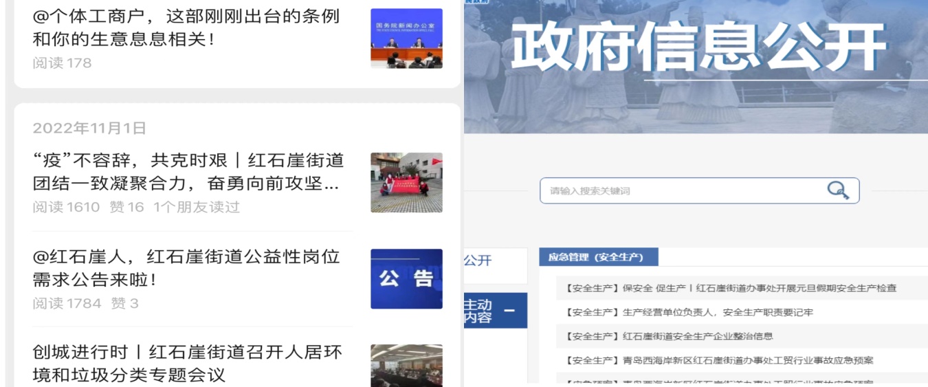 2、通过红石崖街道办事处微信公众号、政务网、新浪微博等线上平台,及时公开各类政府信息。